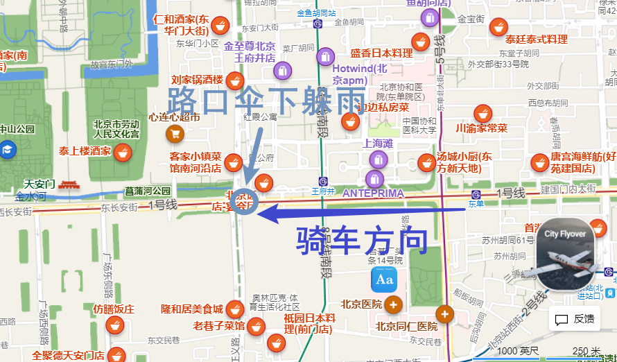 7月24日,在长安街骑车,从西到东折返,刚过王府井,开始下大雨,雨滴在地面砸出比硬币大的痕迹,然后越下越大,红绿灯把我截停,正好停在交通辅警的伞下,本想继续往前冲,辅警小哥拦住说可以再等雨停,看着伞外的瓢泼大雨,既然人愿意收留那就呆着吧。